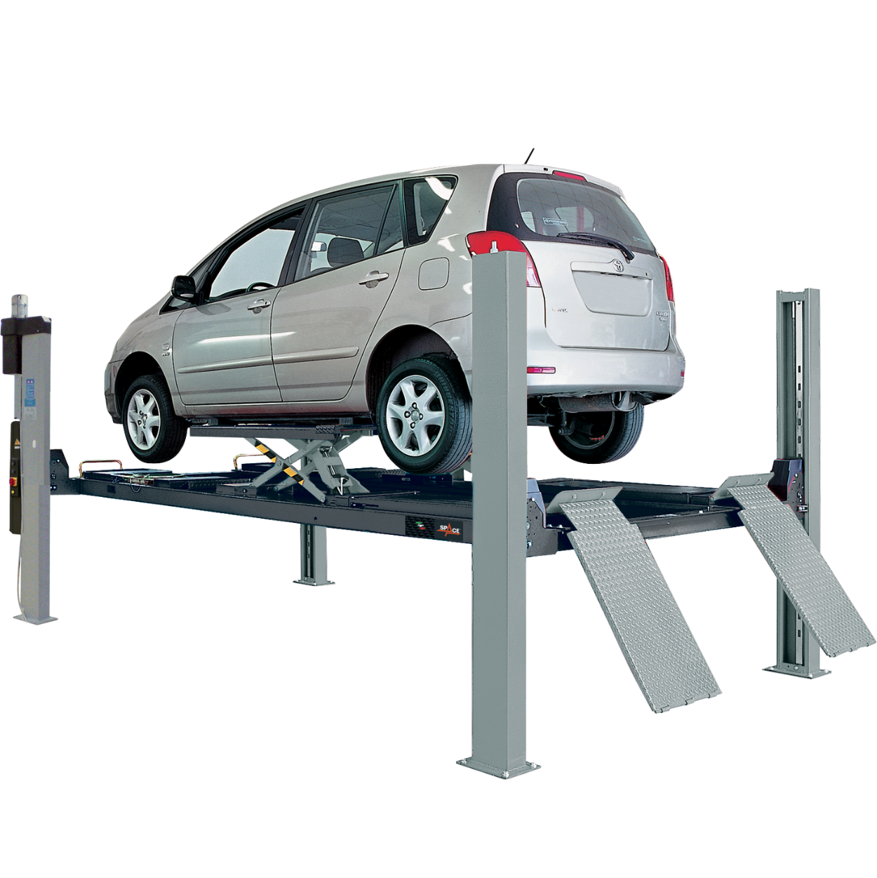 Electro-hydraulic 4 post-lift extra low, high speed lifting and lowering